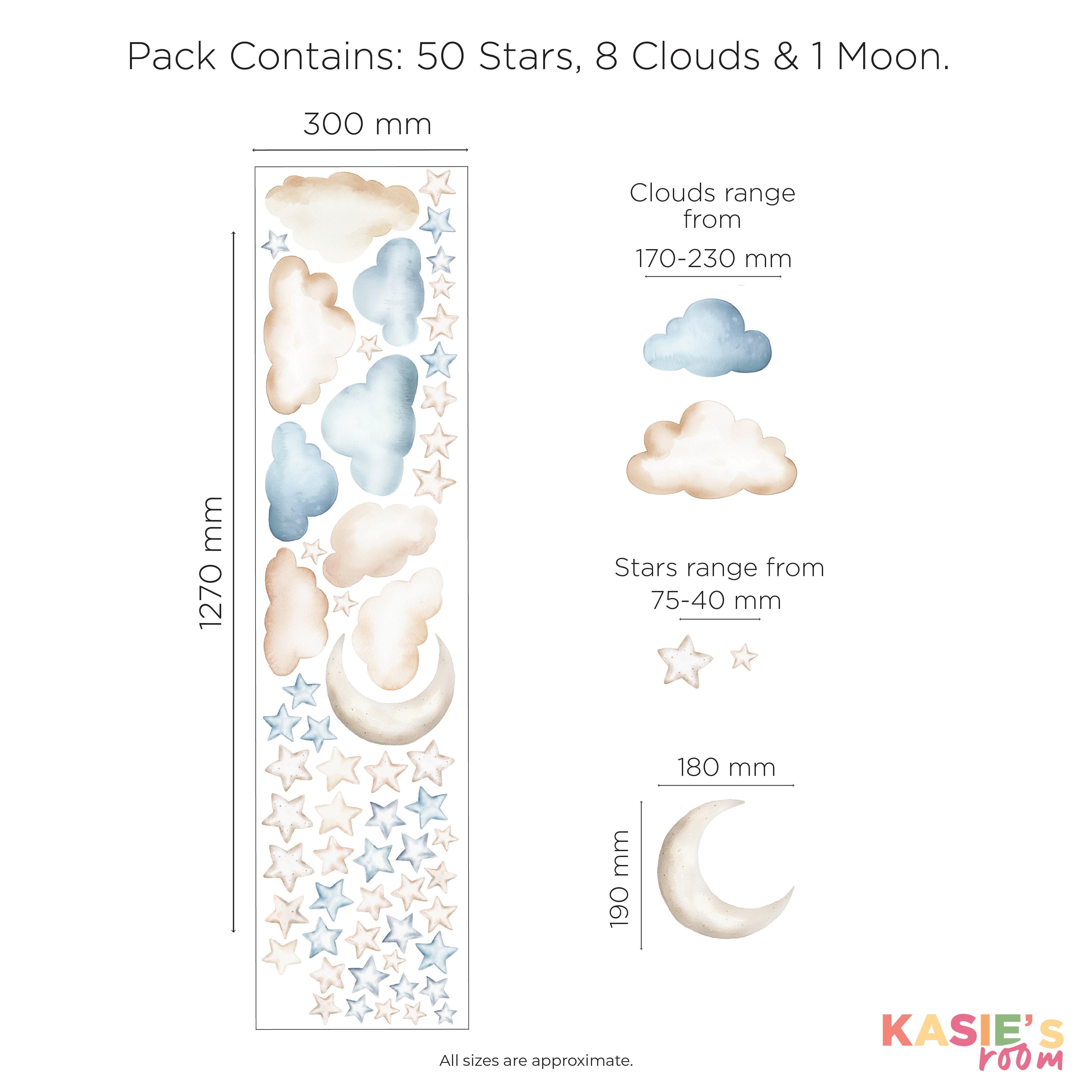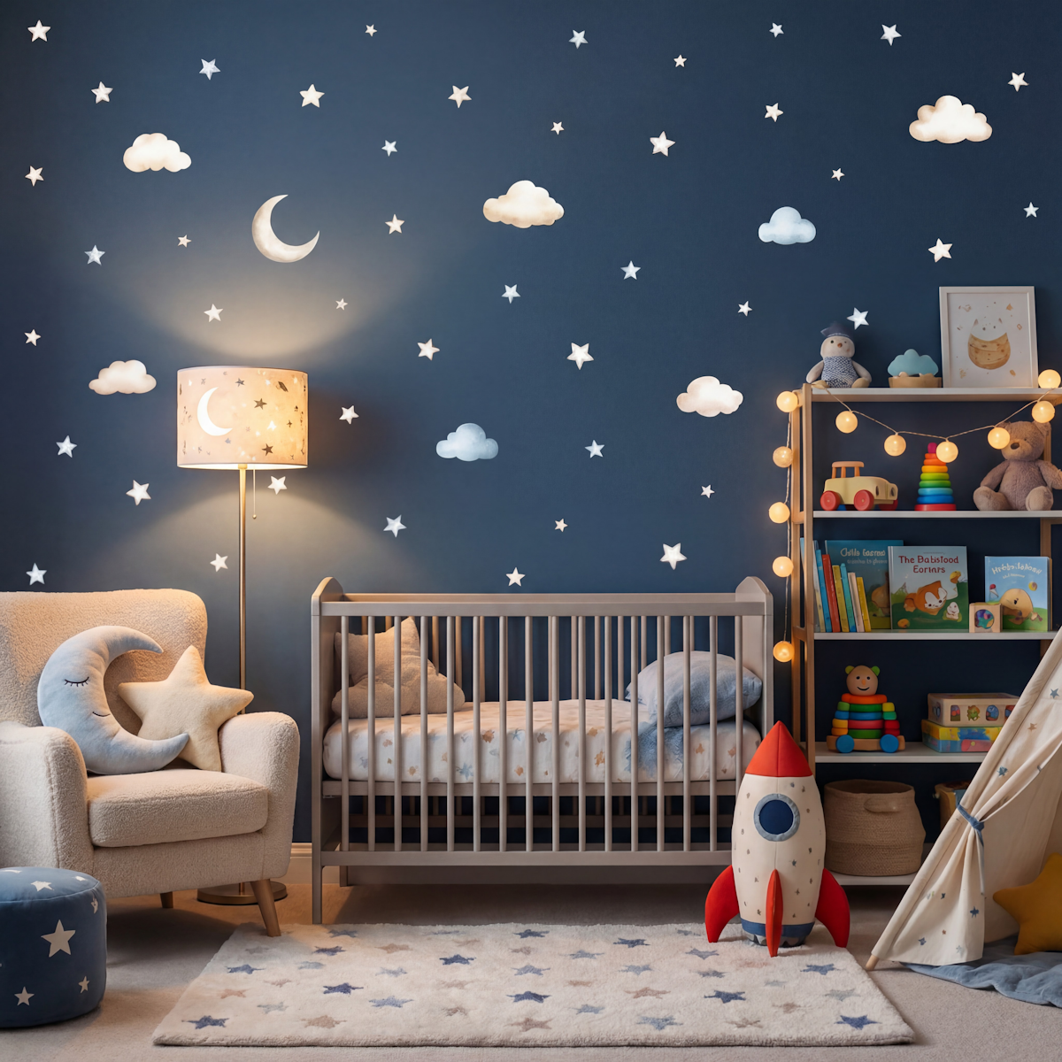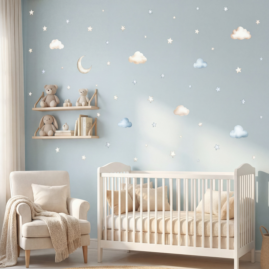 Let your little one drift into a world of calm skies and quiet imagination. This collection brings together soft clouds, twinkling stars, moonlit shapes, and gentle ocean tones to create a soothing, storybook‑sweet backdrop for any nursery or bedroom.